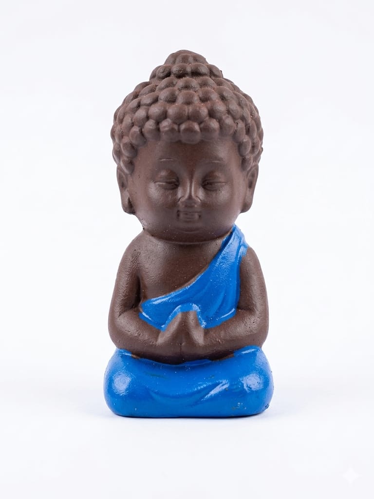 The natural brown finish gives it a classic and earthy look, while the colored robe accents add a touch of vibrancy without overpowering its calm aesthetic. Its compact 8 cm size makes it ideal for placement on desks, shelves, car dashboards, or small decorative corners.