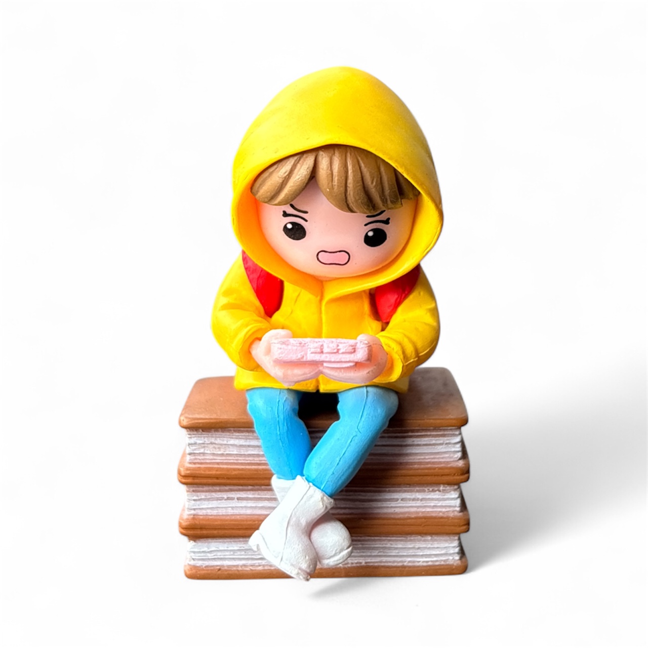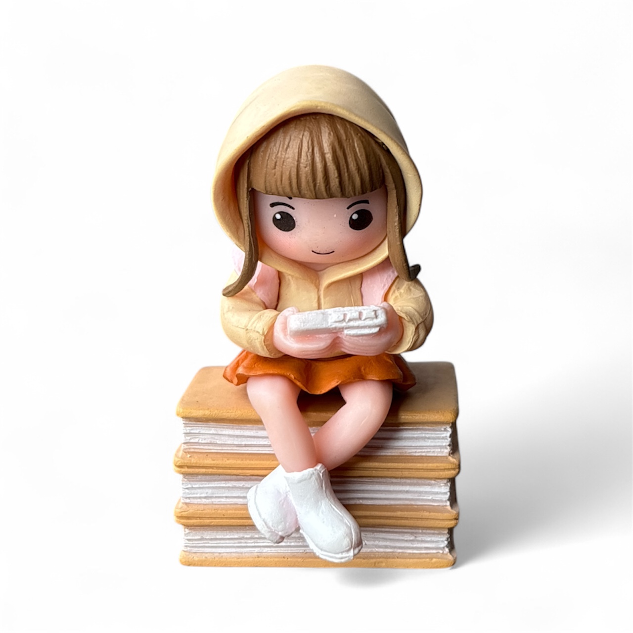 Add a playful and modern vibe to your miniature décor with this Cute Gamer Girl on Book Miniature Set. Featuring an adorable girl wearing a hoodie and backpack while sitting on a stack of books and playing a handheld game console, this figurine captures a fun and expressive moment.