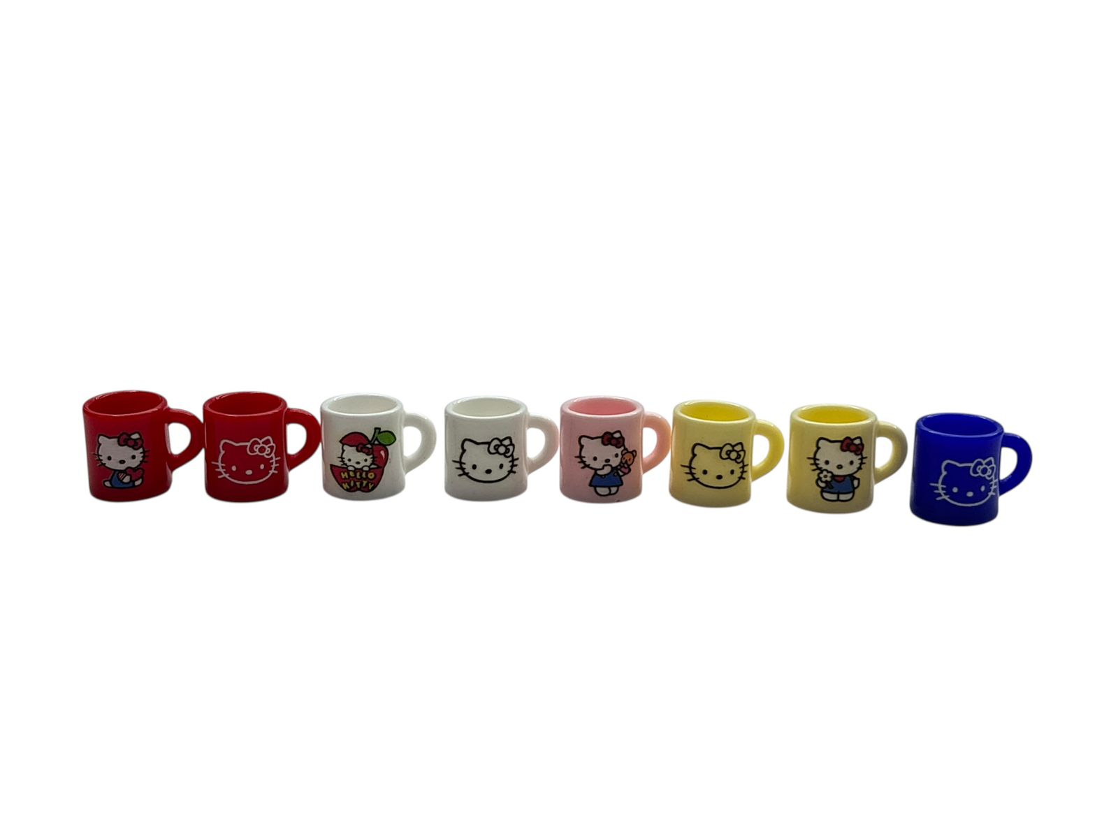 This Hello Kitty mug miniature set features adorable mug designs inspired by classic Hello Kitty artwork. Crafted from durable polyresin, each miniature mug has a smooth finish and vibrant colors that add charm and character to miniature scenes.
