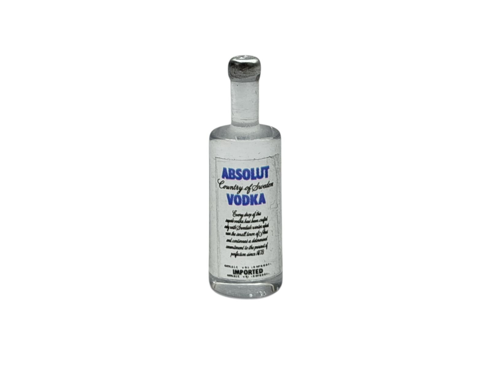 This Absolut vodka bottle miniature is a finely crafted decorative item designed to replicate the iconic bottle in a compact form. Made from durable polyresin, it features a smooth finish, clear bottle styling, and detailed printed labeling for a realistic appearance.