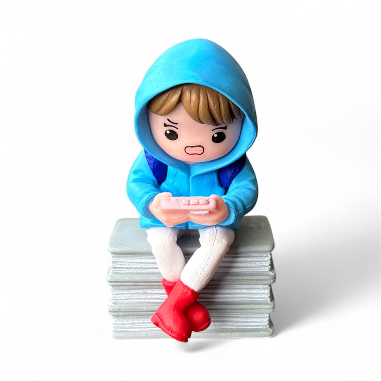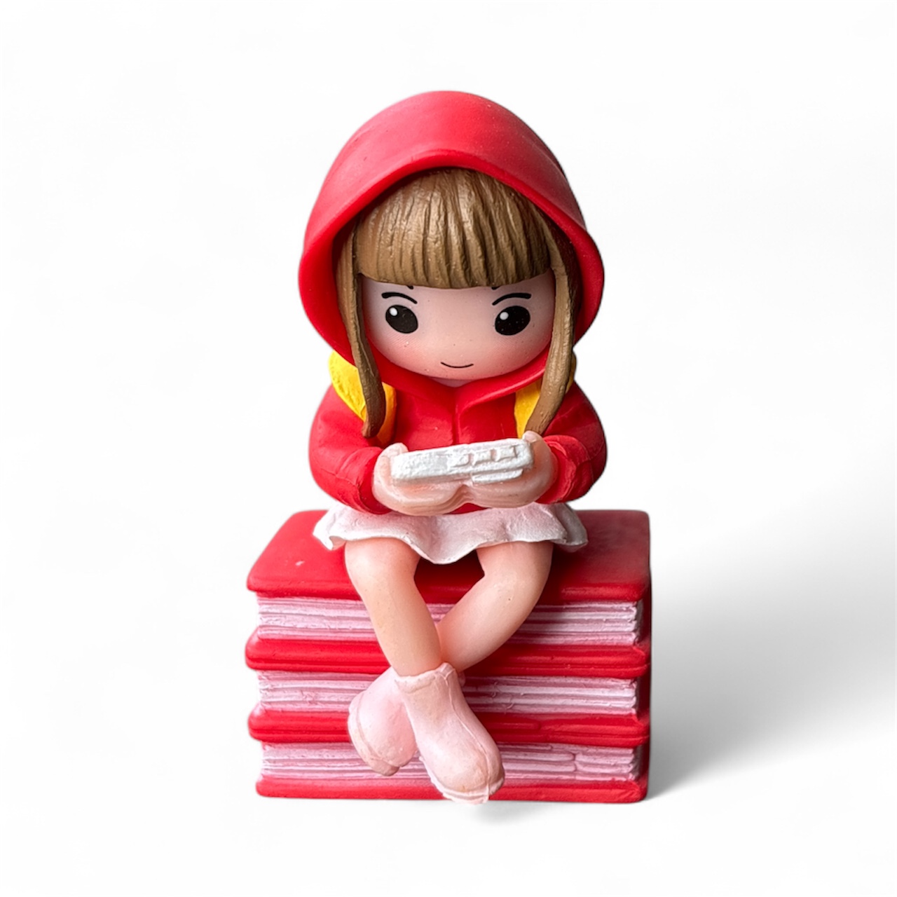 Add a playful and modern vibe to your miniature décor with this Cute Gamer Girl on Book Miniature Set. Featuring an adorable girl wearing a hoodie and backpack while sitting on a stack of books and playing a handheld game console, this figurine captures a fun and expressive moment.